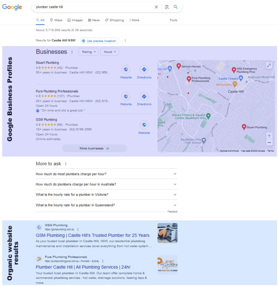 The goal for businesses is to increase their Google Business profile visibility by optimising their profile with accurate and relevant information, adding photos, and gathering reviews from satisfied customers. When businesses are ranked in the top three Google Maps results for a search query, their Business profile is shown above other websites in search engine results, which can drive more leads and conversions.